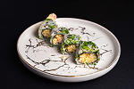 An enchanting blend of eel tempura, foie gras, and cucumber, elegantly layered with truffle oil and gold leaf for a touch of opulence.