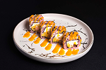 Tempura shrimp, cucumber, and spicy mayo embraced by a roll of soy paper, crowned with slices of creamy mango.